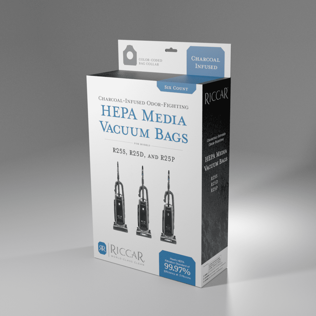 Top-loading HEPA media bags fit the Riccar R25 Clean Air Upright series vacuum cleaners, including the R25S (Standard), R25D (Deluxe), and R25P (Premium).